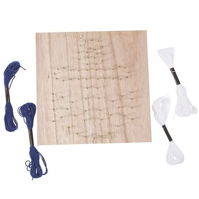 Make a double knot on any nail then weave and wind string around each exterior nail to see overall shape of the design. Fill in the center of the section by going across the design to various nails. When you finish a section, double knot it and cut the excess string. Start a new shape or details inside with a new color and repeat the process.